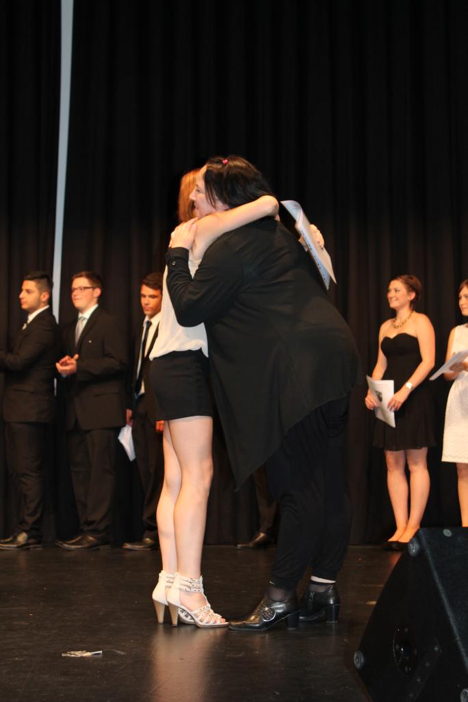 Es folgte zunächst die Zeugnisausgabe an die beiden Berufsreifeklassen 9a und 9b. Frau Hofmann rief die Schülerinnen und Schüler in alphabetischer Reihenfolge auf. Frau Will und die Klassenlehrerinnen Frau Thiel (9a) und Frau Schorn (9b) gratulierten ganz herzlich. Im Anschluss an die Zeugnisausgabe wurden einzelne Schülerinnen und Schüler der Klassen noch einmal besonders ausgezeichnet. Für besonderes soziales Engagement in der Klasse 9a wurde Maren Van der Ley geehrt. Zum Abschluss hatten die Schülerinnen und Schüler die Gelegenheit sich von ihren Klassenlehrerinnen zu verabschieden.
